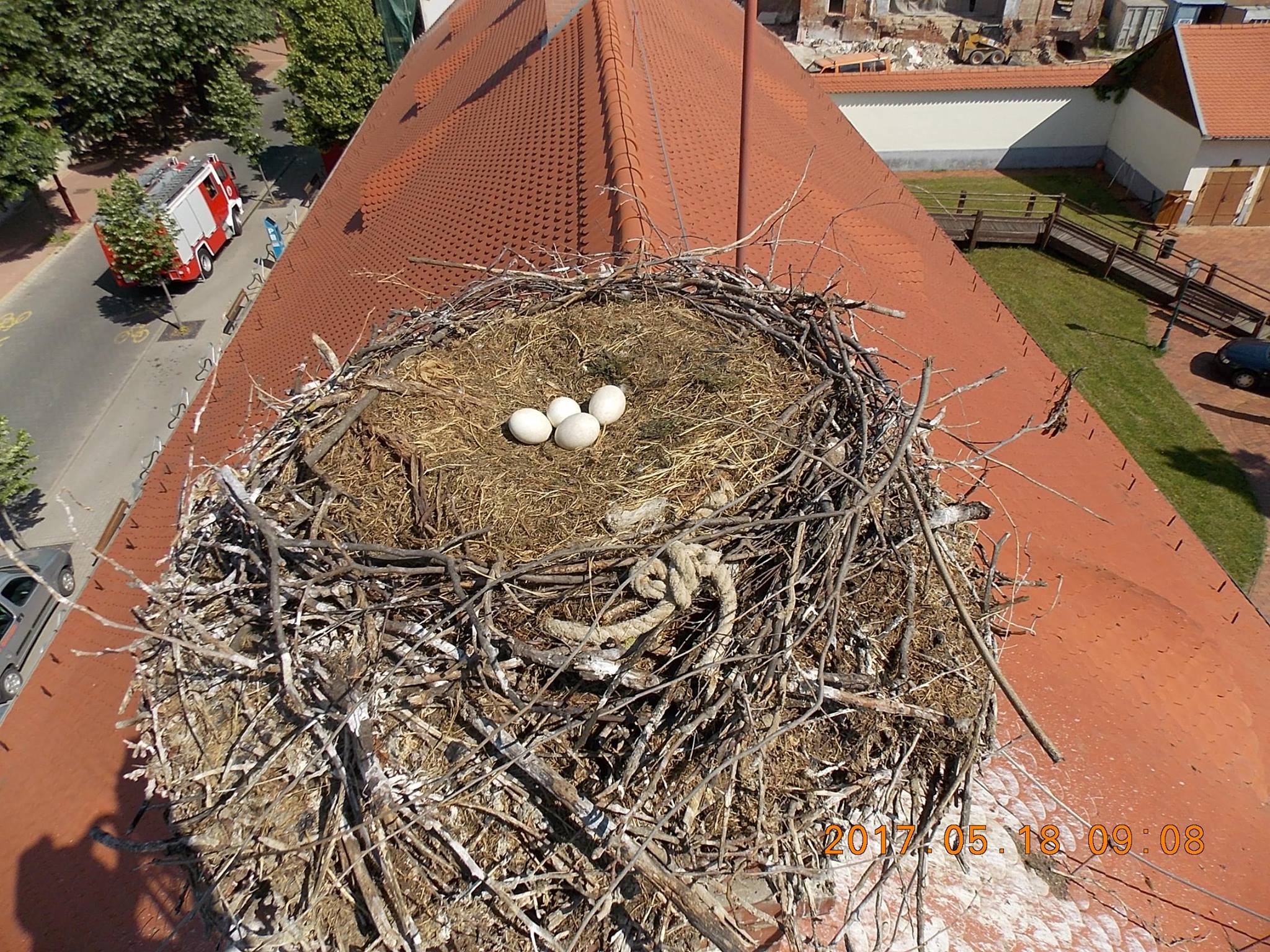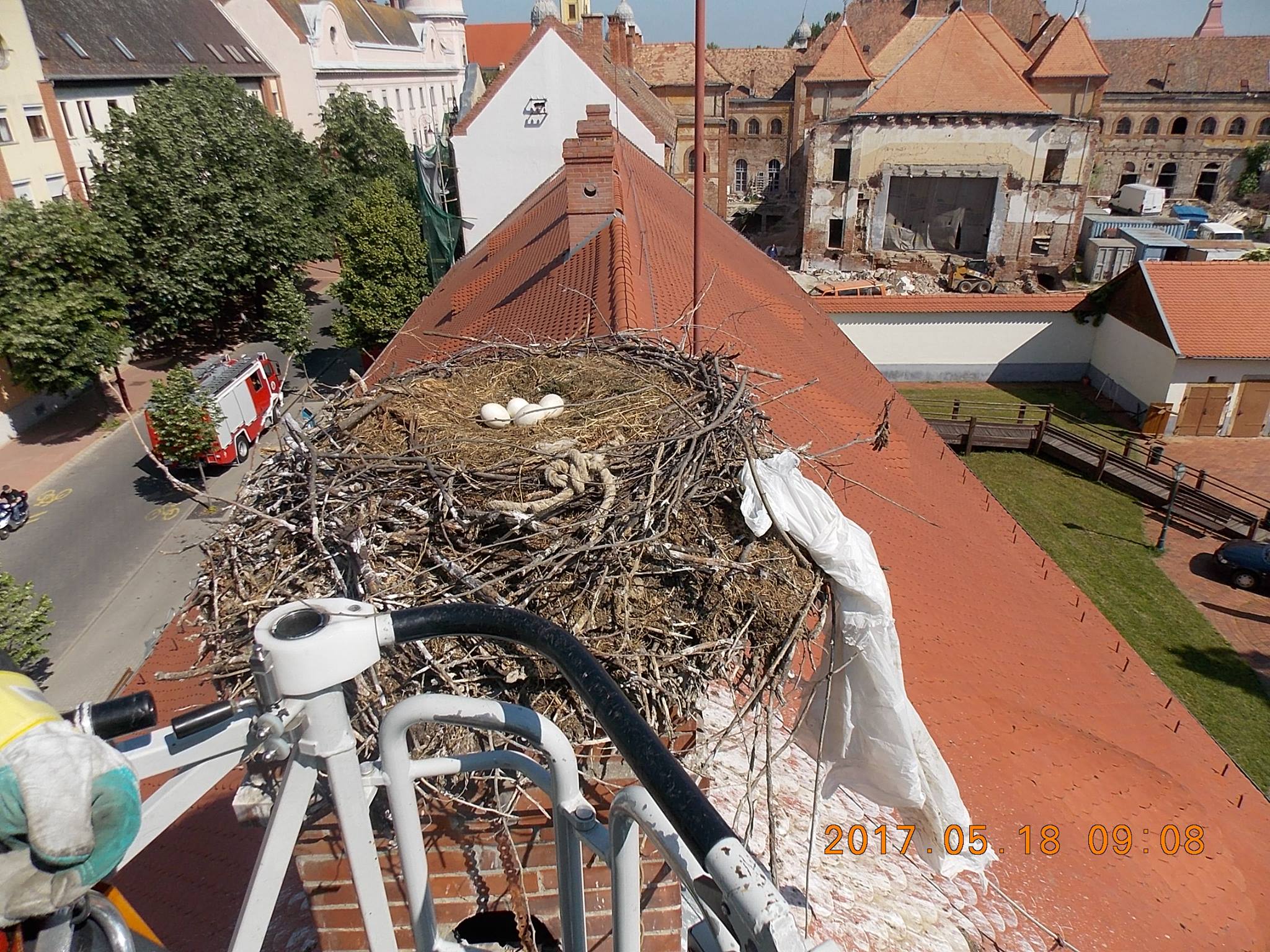 Fennakadt egy nagyobb fóliadarab a Gólyás-ház kéményén található gólyafészek ágain. A négy négyzetméteres műanyag az ott fészkelő madárpárt és leendő kicsinyeit veszélyeztethette, mert könnyen beleakadhatnak a fóliába, amely a madarak sérüléséhez vezethet. A mentéshez a szentesi tűzoltók segítségét kérték. Az egységek gépezetes tolólétra segítségével jutottak fel a több méteres magasságban található fészekhez, amelyben több tojás is volt. Rövid idő alatt eltávolították a fóliadarabot, így a gólyák biztonságban várhatják a fiókák érkezését.