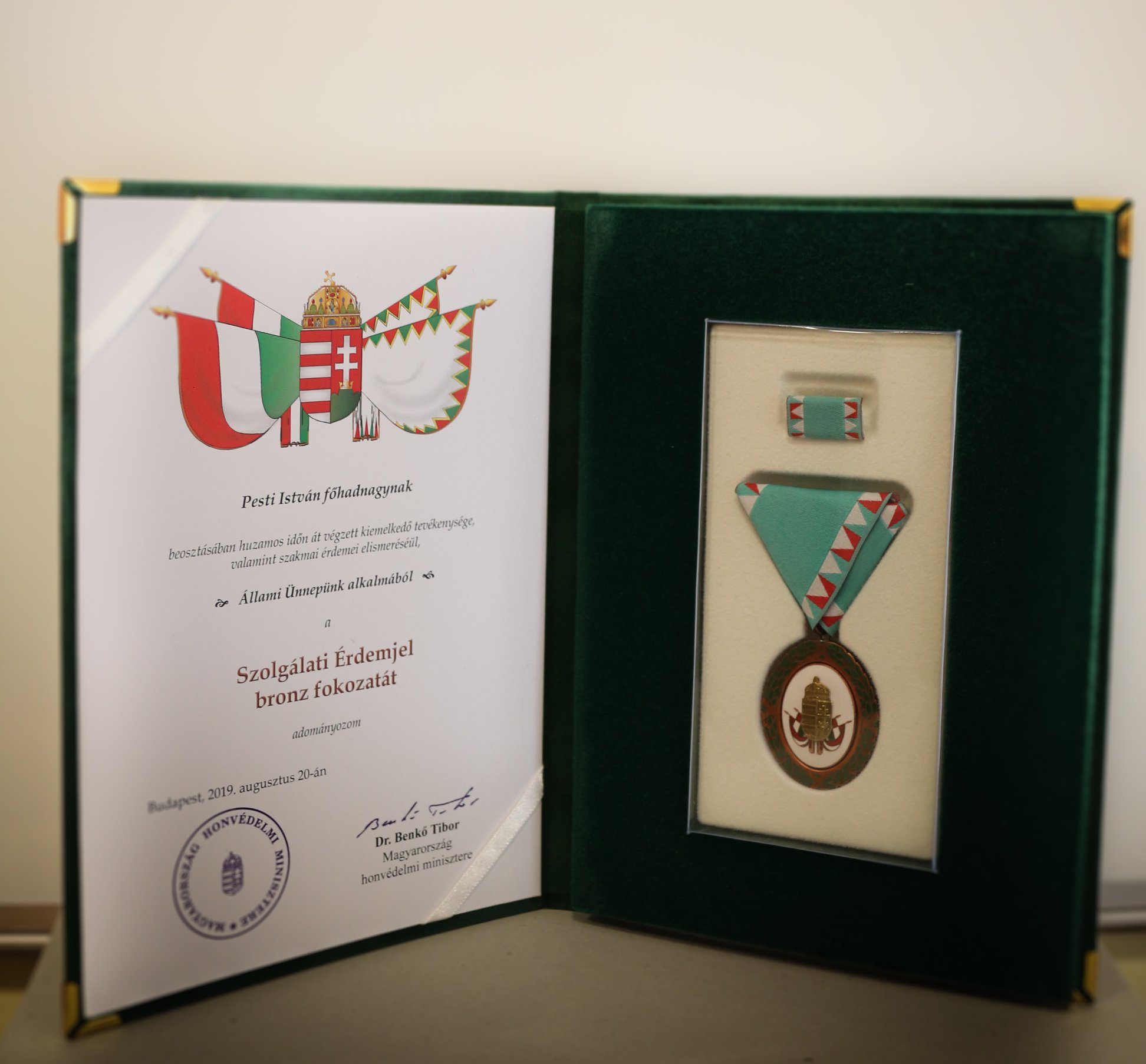 Magyarország honvédelmi minisztere a Szolgálati Érdemjel bronz fokozatát adományozta Állami Ünnepünk augusztus 20. alkalmából beosztásában huzamos időn át végzett kiemelkedő tevékenysége, valamint szakmai érdemei elismeréséül PESTI ISTVÁN főhadnagynak.