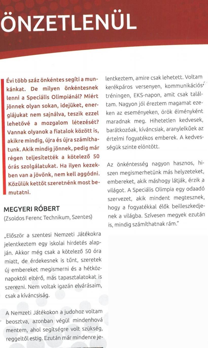 Megyeri Róbert iskolánk 11.c rendész tanulója a Special Olympics önkéntes segítője. Kilencedik évfolyamon e szervezetnél töltötte el az 50 órás közösségi szolgálatát, ahol annyira megtetszett neki a fogyatékkal élő személyekkel való közös munka, hogy azóta minden rendezvényen részt vesz. Egy cikk is készült a tanulóval, mely a következő képen olvasható.
