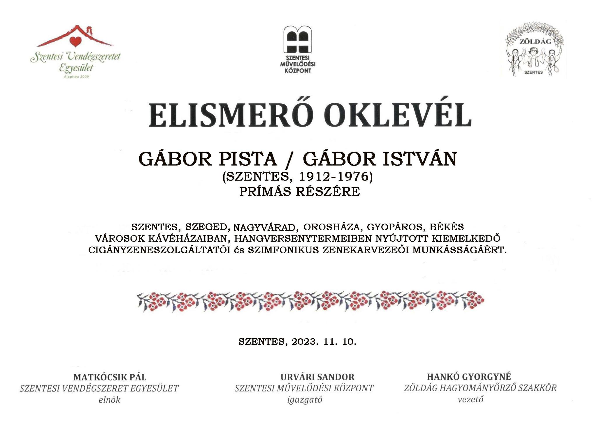 A nóták legjobb ismerői, gyakran szerzői is, és a hegedűk mesterei voltak az egykori cigányprímások. Szentesen több ilyen hegedűvirtuózról tudnak a XX. század derekáig. Közülük az egyik Gábor Pista (1912-1976) volt, aki november 10-én lett volna 111 éves. Talán még élnek itt közöttünk olyanok, akik gyönyörködhettek az ő muzsikálásában a 70-es évekig az akkor virágkorát élő Petőfi étteremben. A cikket a Szentesi Élet 2. oldalán olvashatják.