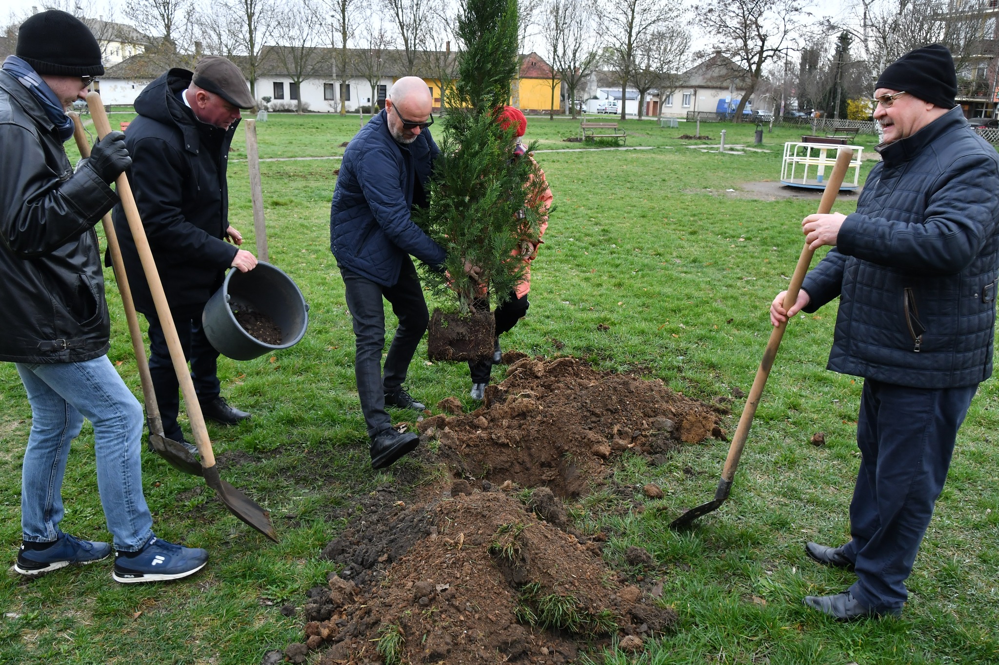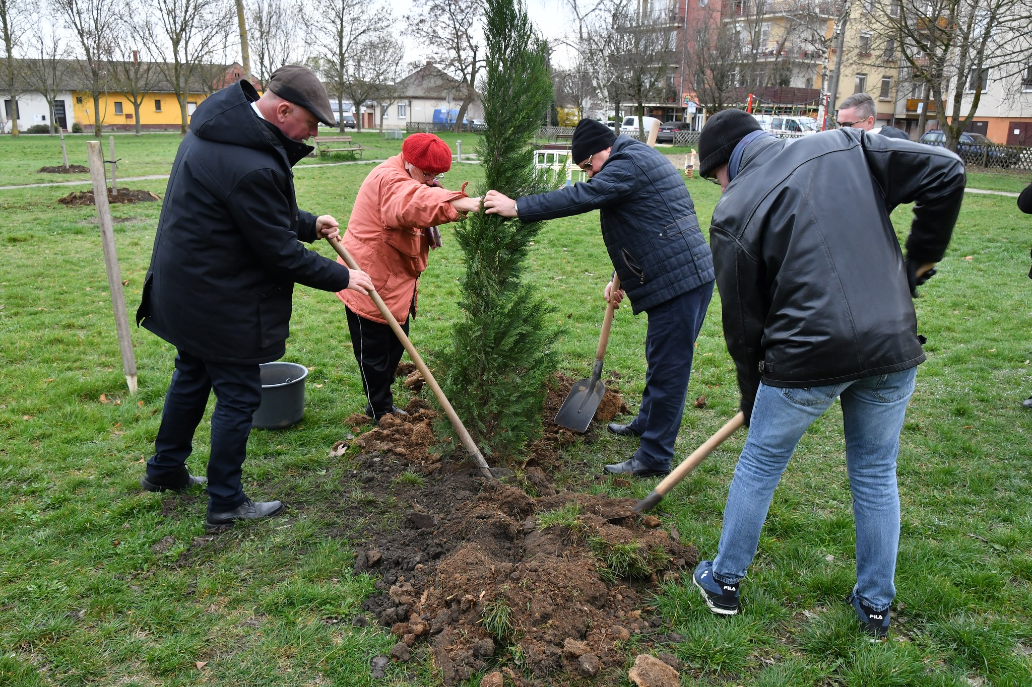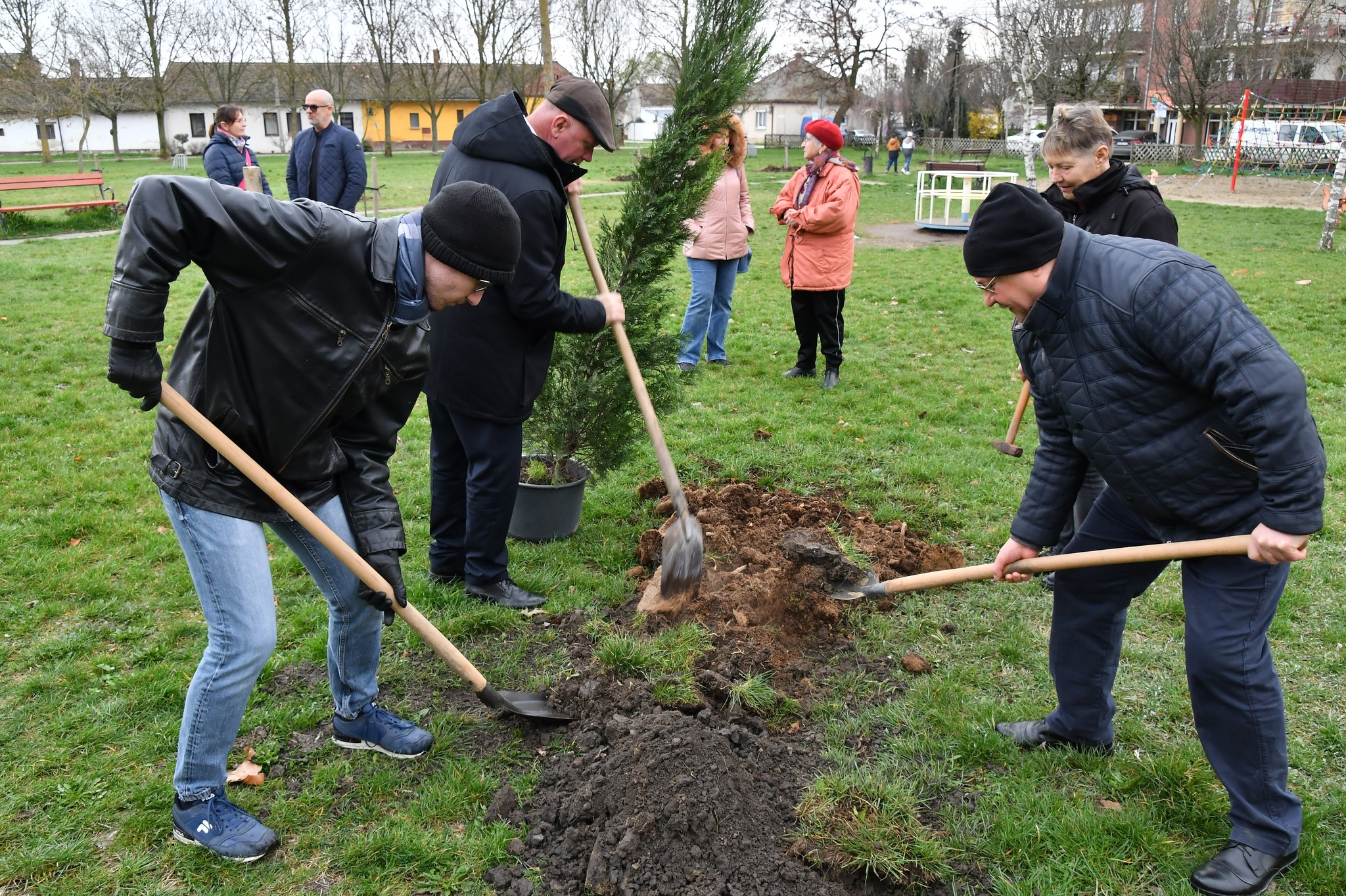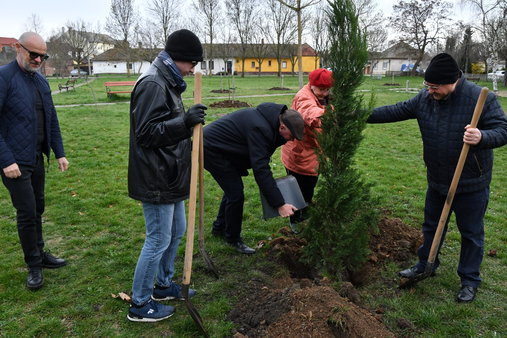 leylandi ciprus, ginko biloba, oszlopos gyertyán, lepényfa, ezüst hárs és korai juhar, melyek szebbé teszik a területet.Szabó Zoltán Ferenc polgármesterrel a Dobos család együtt ültette el az utolsó leylandi ciprus csemetét.