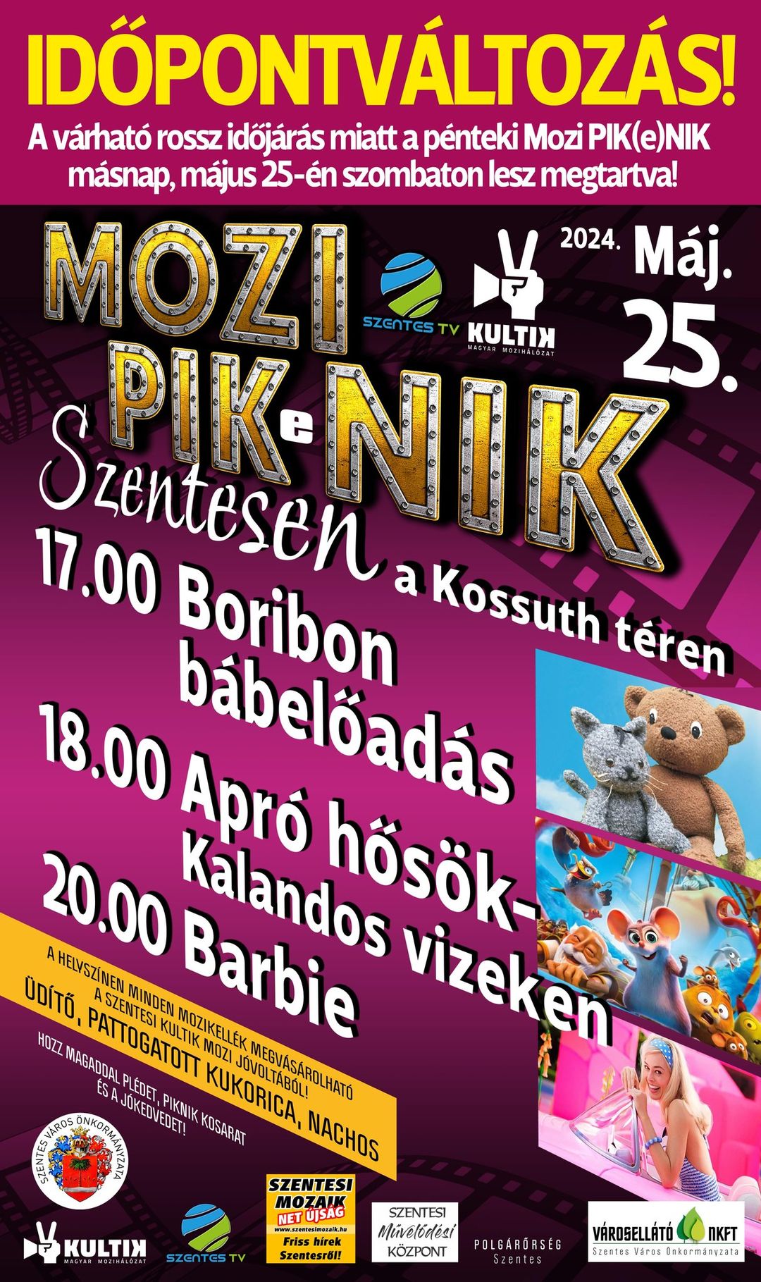 A 2024. május 24-re tervezett MOZI PIK(e)NIK-et a várható rossz időjárás miatt, és a nézők biztonsága érdekében másnap szombaton kerül megrendezésre változatlan formában Szentesen a Kossuth téren.