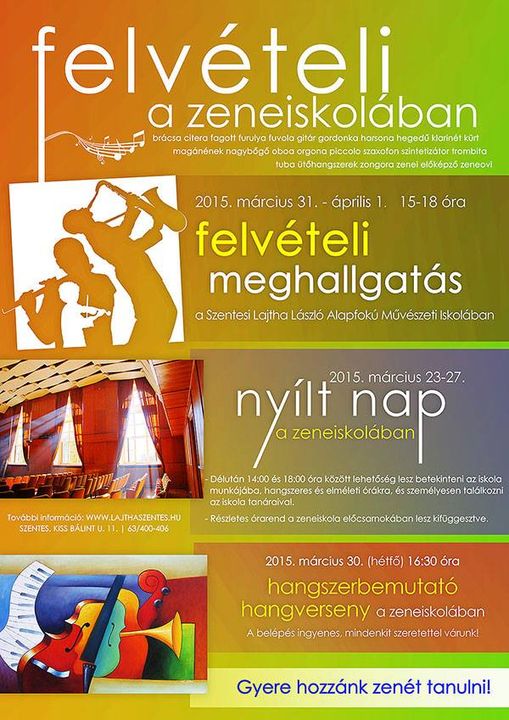 Az iskola életébe való betekintés és ismerkedés után FELVÉTELI MEGHALLGATÁST tartanak az iskolában 2015. március 31-én és április 1-én, 15-18 óra között hangszeres és magánének tanszakokra.