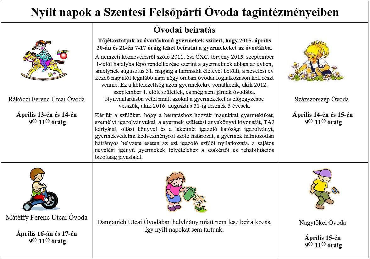 Tájékoztatjuk az óvodáskorú gyermekek szüleit, hogy 2015. április 20-án és 21-én 7-17 óráig lehet beíratni a gyermekeket az óvodákba.