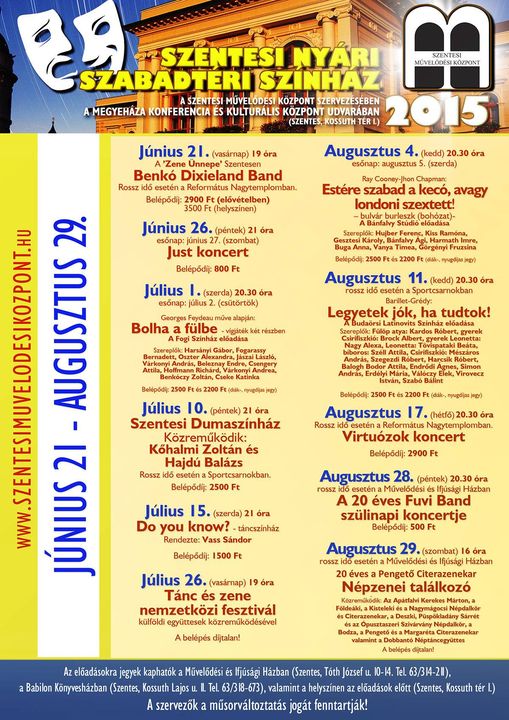 A Megyeháza festői udvarán júniustól augusztusig a komolyabb színházi előadásokat kedvelők éppúgy megtalálják számításaikat, mint a habkönnyű komédiák és a fordulatos operettek szerelmesei, de zenéből, táncból, kulturális expedíciókból sem lesz hiány: a népzenétől a vérbő rock and rollon át a lírai dalokig terjed a repertoár. A programsorozat kiváló művészek és fiatal tehetségek közreműködésével aranyozza be a szentesi nyári estéket.