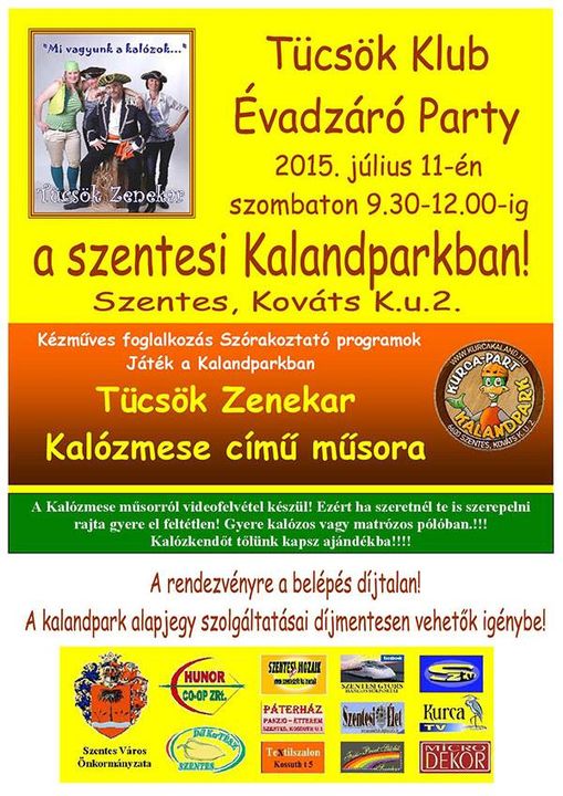 A Tücsök Zenekar Tücsök Klub Évadzáró Party-t szervez 2015. július 11-én (szombaton) 9.30-12.00-ig a szentesi Kurca-part Kalandparkban (Szentes, Kováts K.u.2. ).