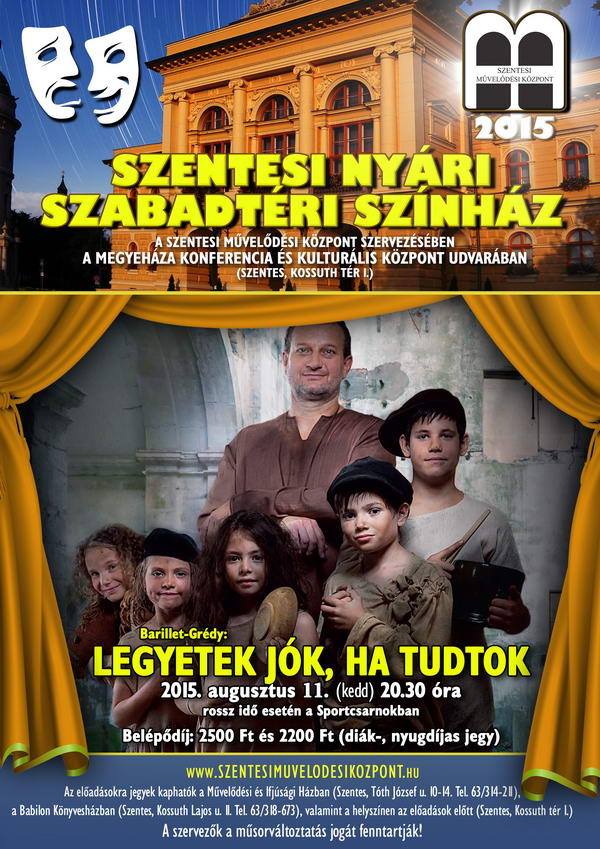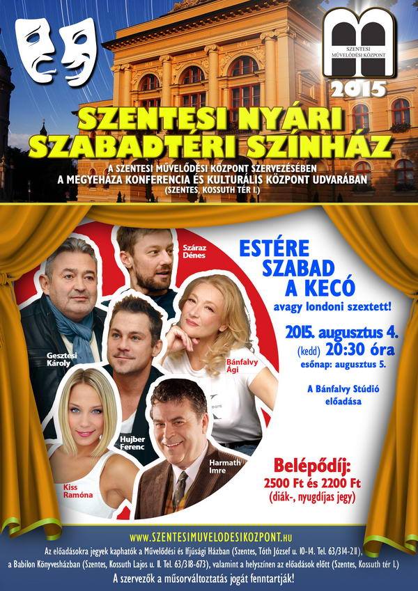 Könnyen emészthető, ám mégis tartalmas nyári kultúrmenüt állított össze a Szentesi Művelődési Központ az idei Szentesi Nyári Szabadtéri Színház programjaival. A vidáman csacsogó Kurca-folyó partjain, a Tisza és a Hármas-Kőrös ölelésében fekvő derűs városkába nemcsak a napfény és a termálvizek miatt érdemes ellátogatni nyáron, hanem elérhető árú, gazdag kulturális kínálata is meggyőző érv.