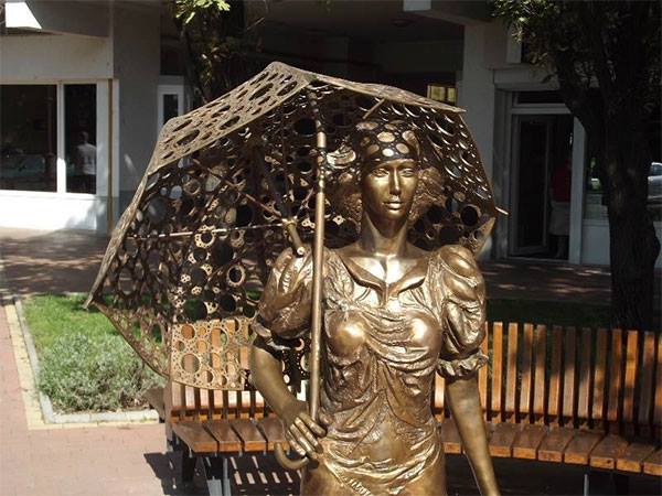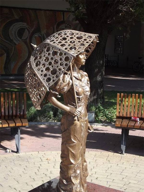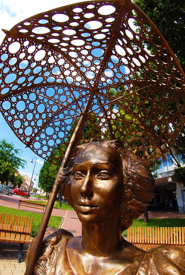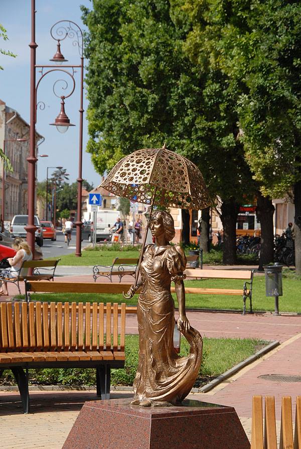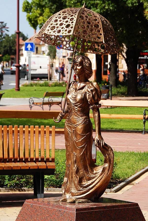 A szobor még 2013-ban készült. A szobrot a Kossuth tér 2014-es átalakításával a volt parkoló helyén helyezték el. A hangulatos kis terecskén márvány talapzaton álló lány hosszú ruhájának alját bal kezével fogja, jobb kezében napernyőt tartott a kezében eddig! Mert valakinek az útjában volt az esernyő és annak pálcáját eltörte. Biztos, hogy ellopni nem akarta, mert nem vitte el, de akkor mi értelme volt cselekedetének??? Szerintünk semmi!