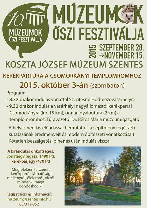 Kedves kirándulni, kerékpározni szerető Olvasóink! Kerékpártúrát szerveznek a csomorkányi templomromhoz 2015. október 3-án. Leírás a mellékletben. Kérjük az érdeklődőket, hogy regisztráljanak az eseményre 2015. szept. 29-én délután 16 óráig, hogy a kerékpárok szállításához szükséges pótvagont meg tudják rendelni a MÁV-nál. Lehet csatlakozni a közbeeső települések (Szegvár, Mindszent, Mártély) vasútállomásán, ill. Hódmezővásárhelyen a nagyállomáson. Mindenkit szeretettel vár a Koszta József Múzeum!