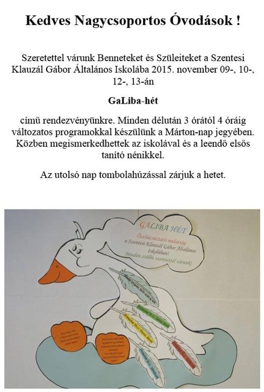 A Szentesi Klauzál Gábor Általános Iskola szeretettel várja a nagycsoportos óvodásokat és szüleiket november 9-én, hétfőn, 10-én, kedden, 12-én csütörtökön és 13-án pénteken GaLiba-hét elnevezésű programjára a Márton-nap jegyében.