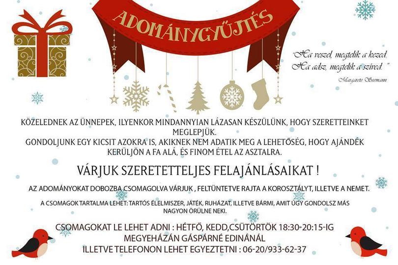 Ha úgy gondolja, hogy támogatja e nemes cselekedetet, akkor a plakáton olvasható feltételekkel elkészített csomagokat december 10-ig leadhatják a Megyeházán Gáspárné Edinánál.