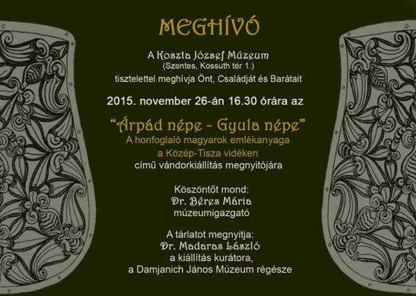 Szeretettel meghívunk minden Érdeklődőt 2015. november 26-án csütörtökön régészeti vándorkiállításunk megnyitójára, melynek címe: „” A honfoglaló magyarok emlékanyaga a Közép-Tisza vidéken. A tárlatot megnyitja Dr. Madaras László a kiállítás kurátora, a Damjanich János Múzeum régésze.
