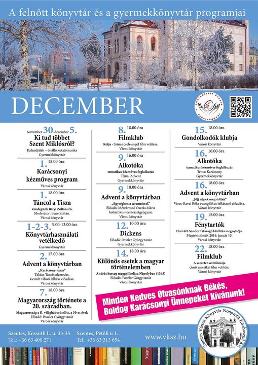Decemberben is változatos programokkal várják a kultúra szerelmeseit a felnőtt és a gyermekkönyvtárban. December 1-jén karácsonyi kézműves foglalkozással indul az adventi időszak, melyet a filmklub A szeretet szimfóniája film zár le. Reméljük mindenki megtalálja számítását az ünnepek havában. Mindezek mellett találkozhatunk az Adventi Vásárban a Szent Miklós téren és válogathatunk a könyvtárban kapható helyi kiadványokból.