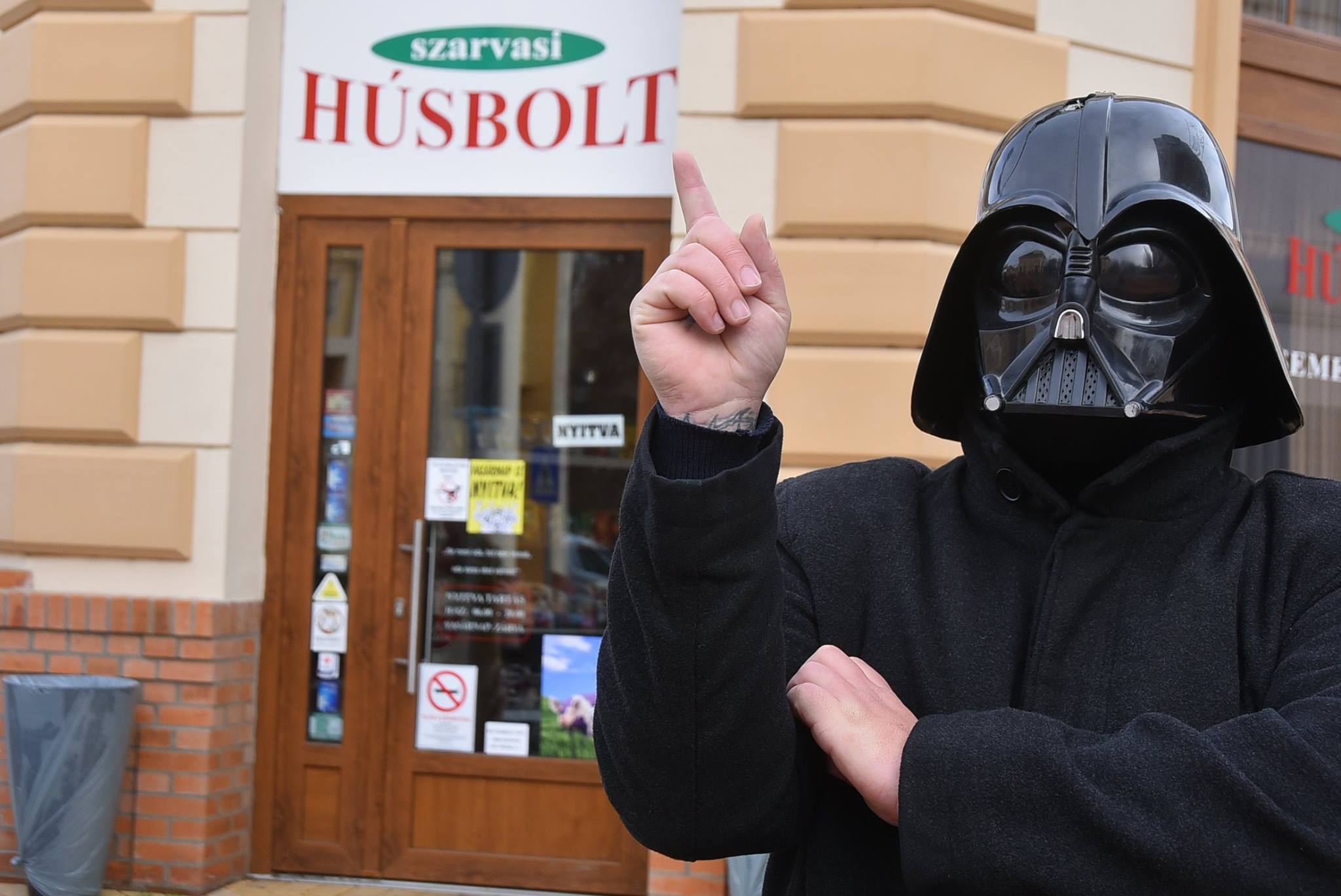 Miután búcsút vettünk a nagyúrtól, akkor kaptuk a hírt, hogy egyik Sith harcosát itt hagyta, hogy addig is szórakoztassa a szentesieket. Munka közben lencsevégre kaptuk a húsboltban, ahová bárki betérhet egy közös képért!