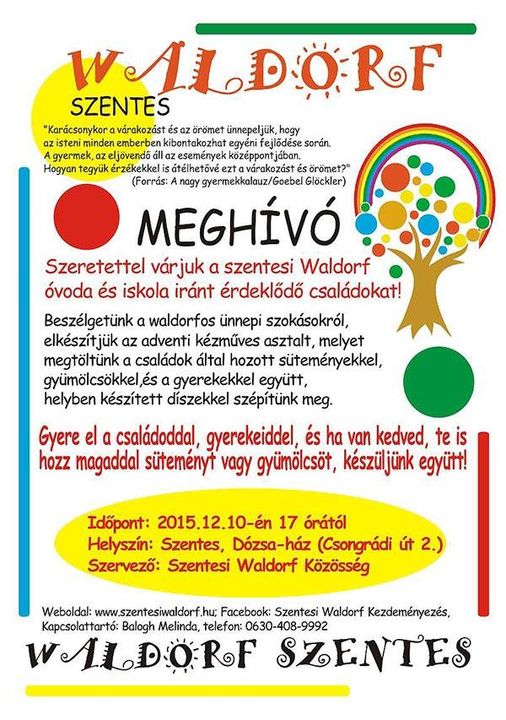 A Szentesi Waldorf kezdeményezés 2015. december 10-én 17-órától újra szeretettel várja azon, – elsősorban 2-6 éves – gyermekek szüleit, akik az állami oktatáshoz képest markánsan eltérő elvek alapján szerveződő Waldorf óvodában vagy iskolában képzelik el utódaik jövőjét.