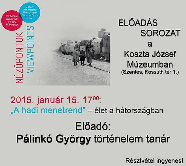 Pálinkó György történelem tanár a Koszta József Múzeum Nézőpontok-Térhatású fényképek a Nagy Háborúról című, az I. világháborút 3D-s fényképeken bemutató kiállításához kapcsolódó előadássorozatának harmadik, „A hadi menetrend” – élet a hátországban című előadása a tervezett december végi időpont helyett JANUÁR 15-én (pénteken) 17:00-kor kerül megrendezésre.