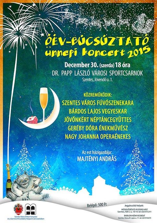 Idén 17. alkalommal rendezik meg az Óév-búcsúztató ünnepi hangversenyt 2015. december 30-án a Dr. Papp László Városi Sportcsarnokban. A rendezvényen közreműködik Szentes Város Fúvószenekara, a Bárdos Lajos Vegyeskar, Jövőnkért Néptáncegyüttes, Geréby Dóra – énekművész és Nagy Johanna – operaénekes.