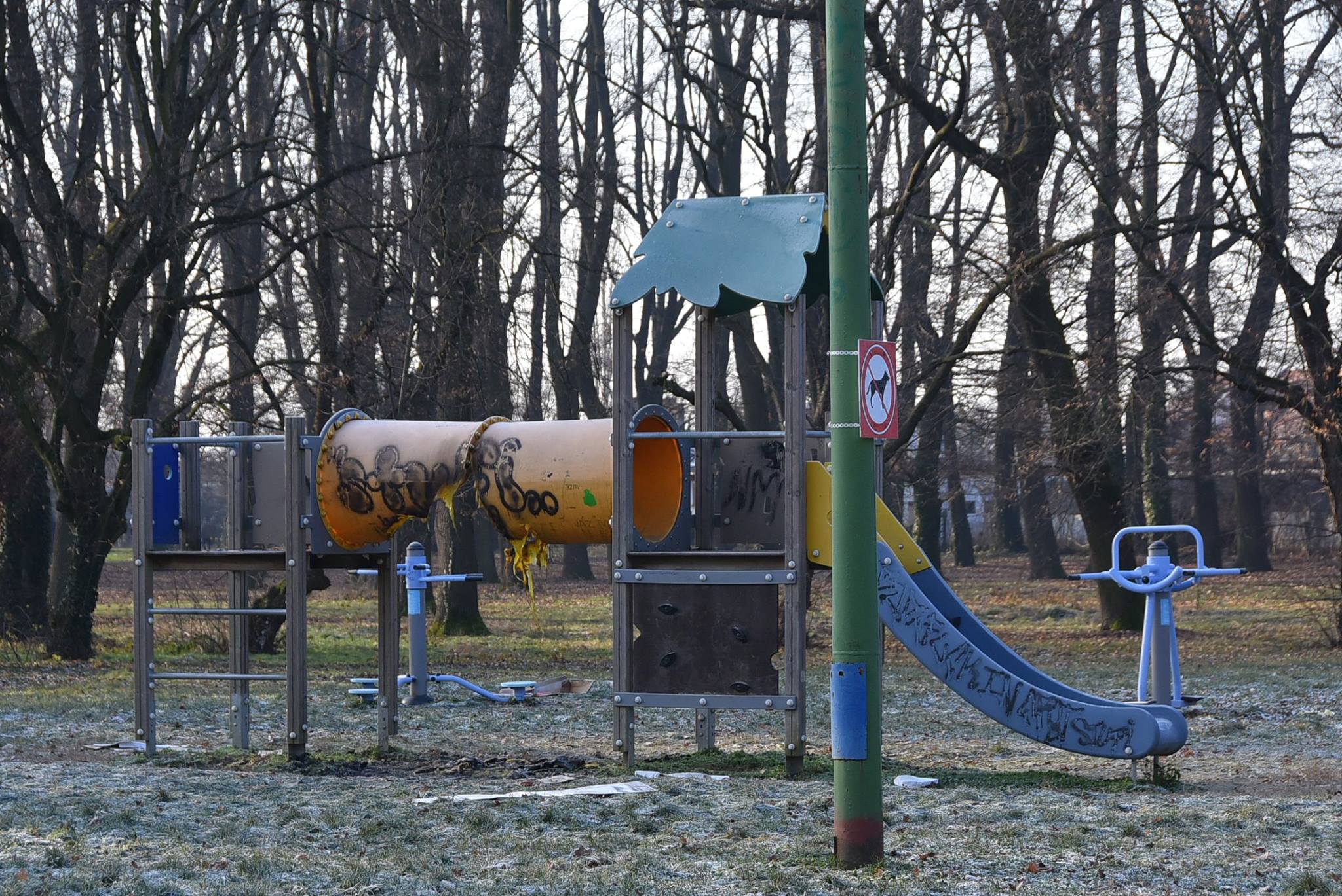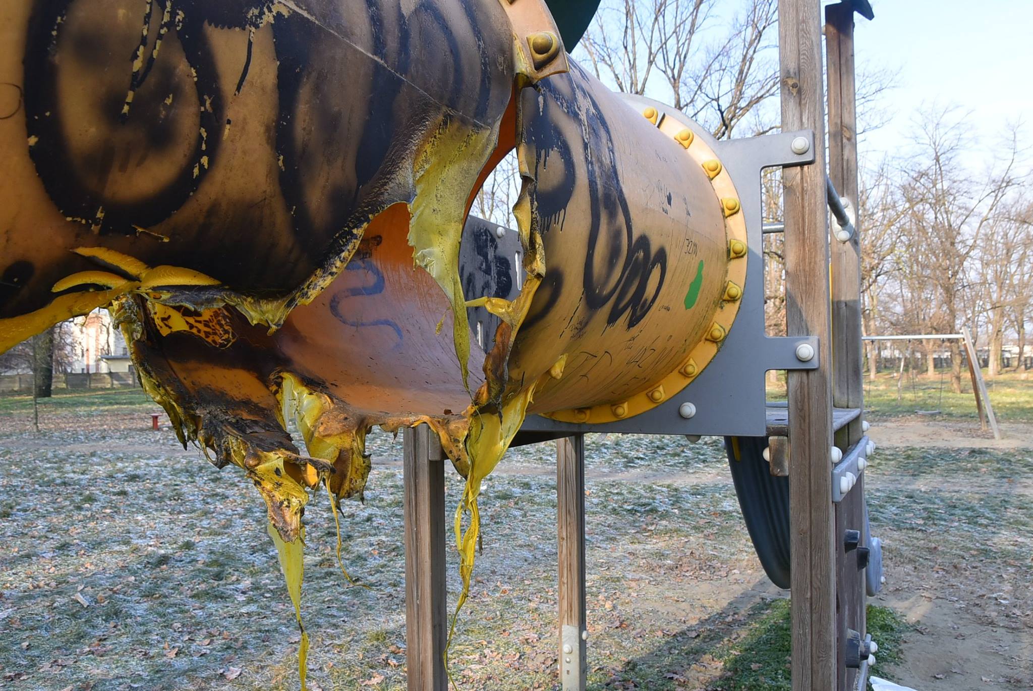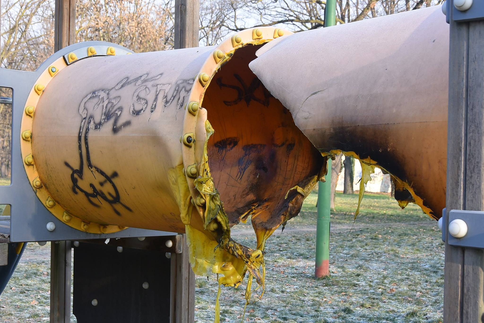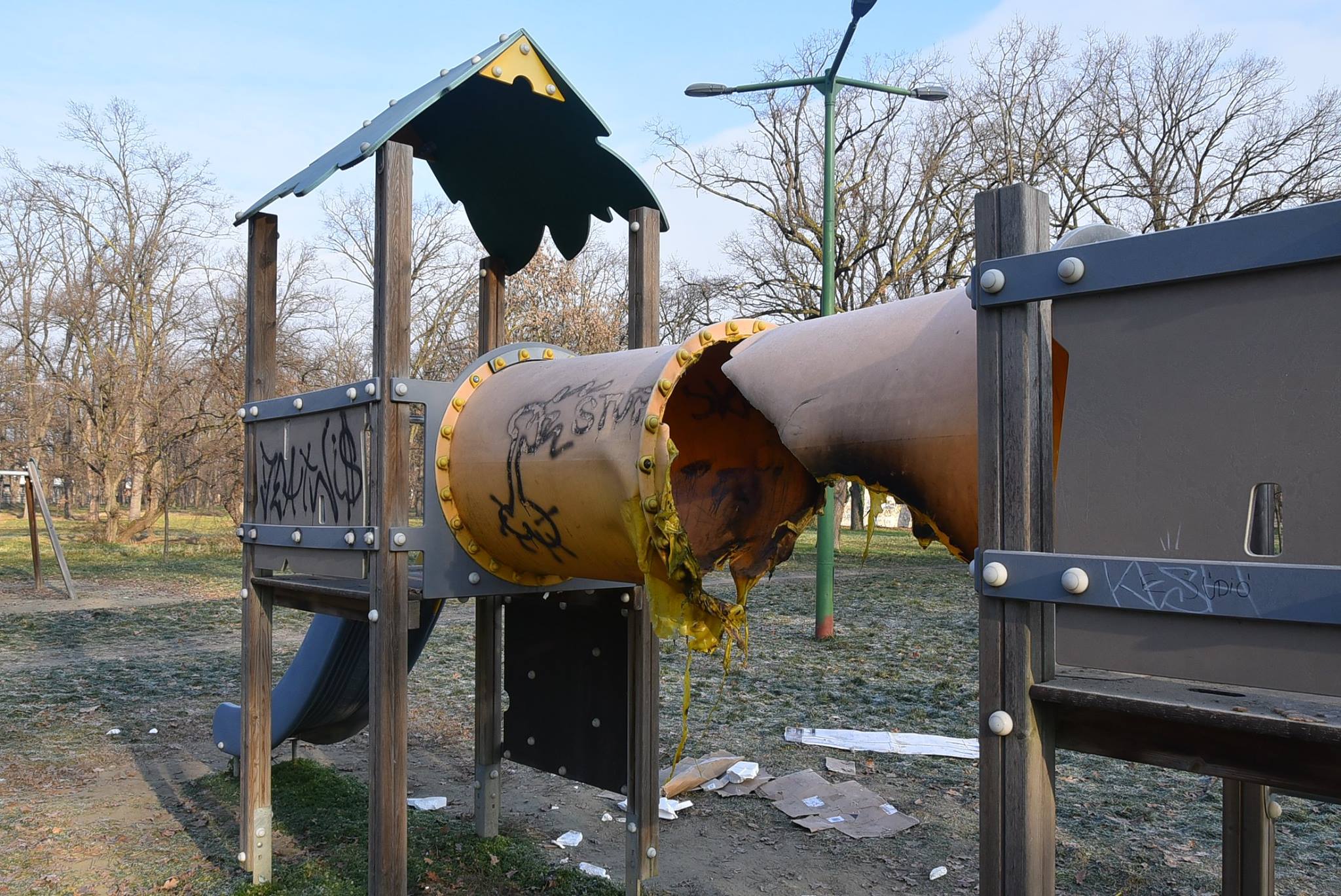 Nem tudjuk, hogy mi volt a cél, hogy csak megelégelték a csőben időnként ott éjszakázó hajléktalanokat, de akkor sem ez a jó megoldás. Így most balesetveszélyessé vált a csúszda, és biztos, hogy egy ideig nélkülözni kell a gyermekeknek ezt a játékot.