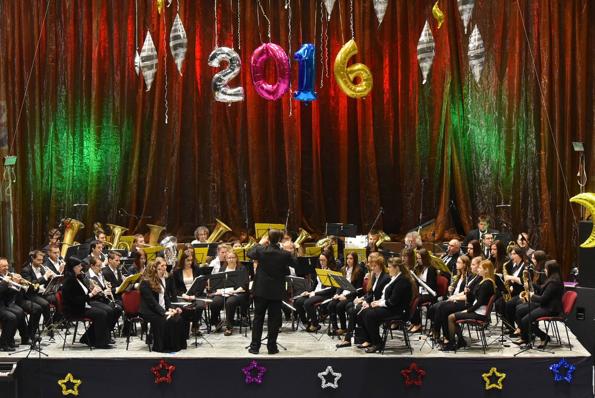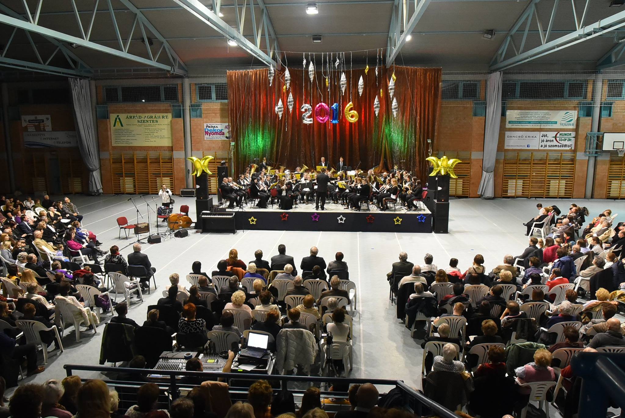 Sportcsarnokban. A rendezvényen közreműködött Szentes Város Fúvószenekara, a Bárdos Lajos Vegyeskar, Jövőnkért Néptáncegyüttes, Nagy Johanna és Németh Márton – operaénekes.Kedves hagyomány, hogy ezen az év végi rendezvényen köszöntik azokat a fúvószenekari tagokat, akik hosszú évek óta közreműködnek az együttesben. Idén Balogh Krisztián tubás és Sipos Kálmánné Kondorosi Réka fuvolás munkáját ismerték el, melyet közösségért végzett.