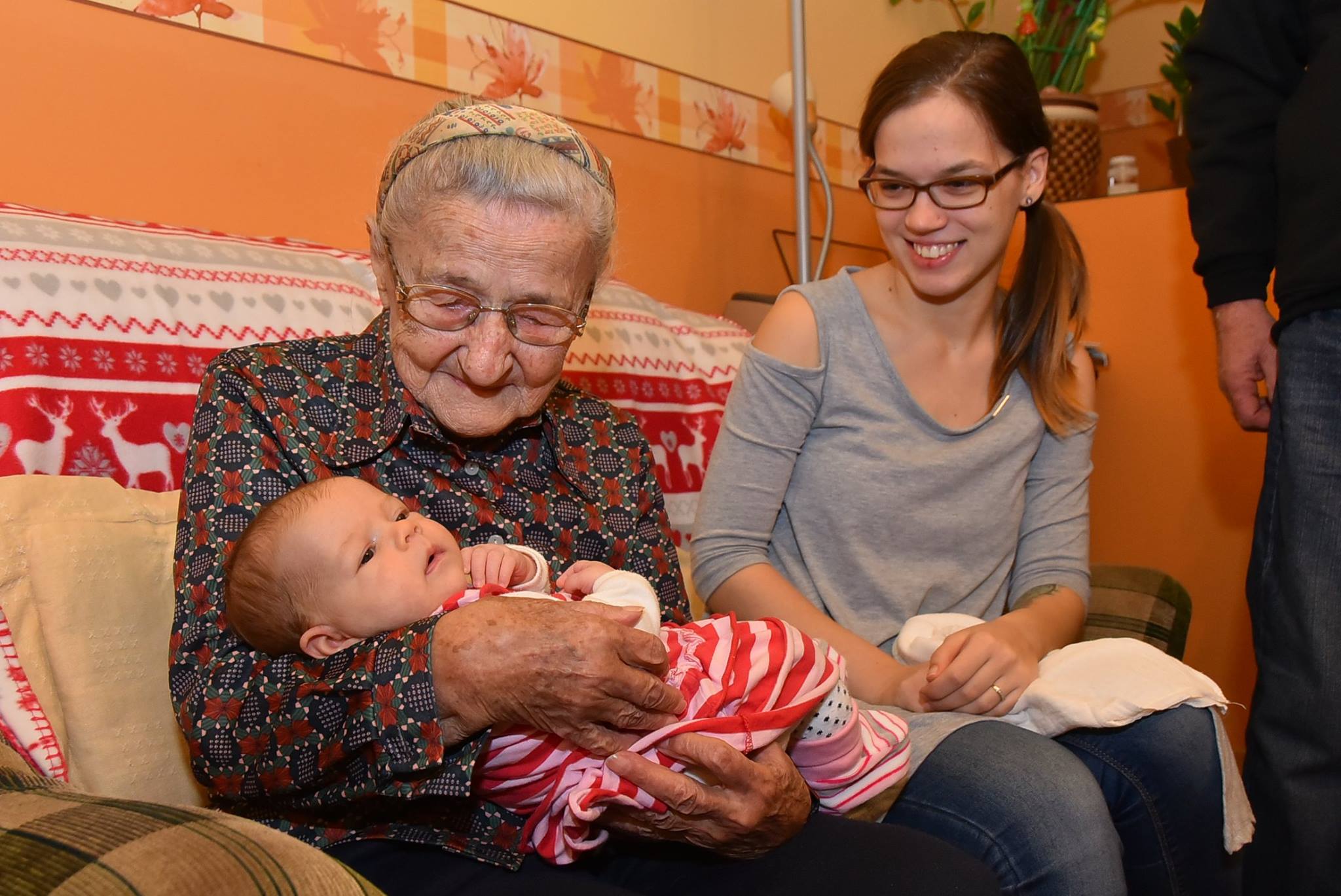 A legmeghatóbb pillanat volt amikor Sára néni kezében tartotta ükunokáját a hét hetes Mirát.