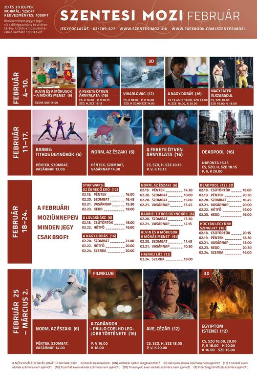 Már készülhetünk a februári moziünnepre, amikor is a Szentesi Moziban minden jegy 890 Ft-ba kerül egységesen. Lepje meg szerettét mozijeggyel. A plakáton olvasható filmekből válogathat február 18-24 között!!!!