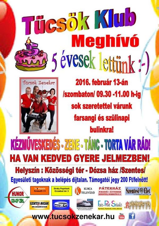 Sok szeretettel várnak mindenkit 2016. február 13-i Tücsök Klub Szülinap és Farsangi rendezvényre. Kézműveskedés – Zene – Tánc – Torta vár rátok! Az emeleten kis Játszóházat alakítanak ki a gyerekeknek. Ünnepelj az együttessel együtt!