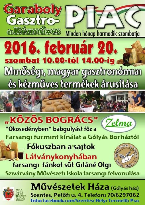 2016. február 20-án újra kinyitja kapuját a Garaboly Gasztro- és Kézműves Piac a Művészetek Házában. Ezen a napon fókuszban lesznek a sajtok, de bárki megkóstolhatja a Zelma okosedényben főtt babgulyást is. Természetesen a farsangi időszakban jól esik mindenkinek a farsangi fánk, melyet Giláné Olgi vezetésével készül. A délelőtt folytán a Szivárvány Művészeti Iskola növendékei farsangi felvonulását is megtekinthetjük.
