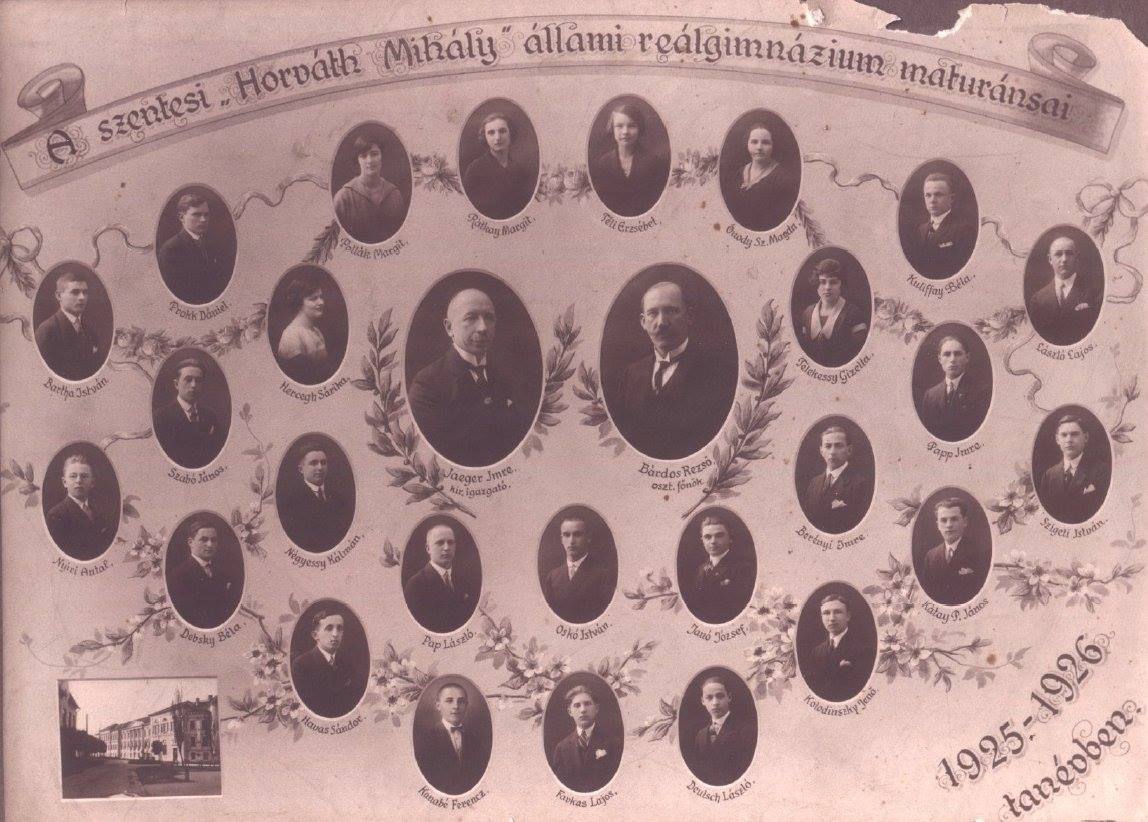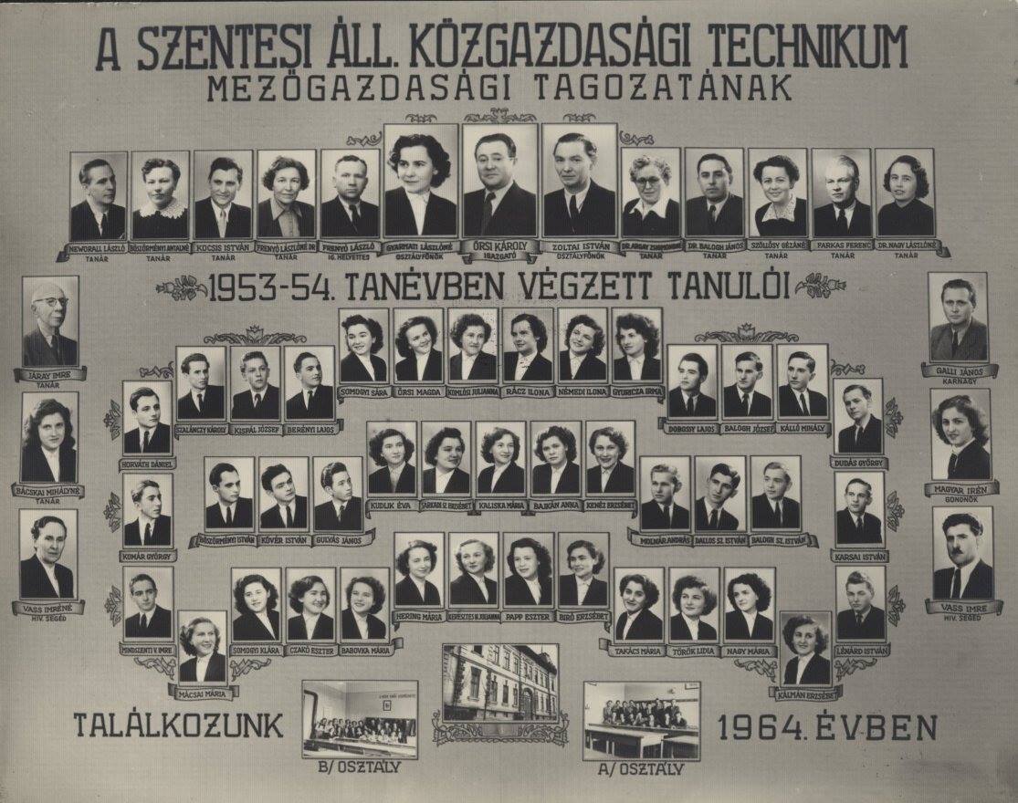 Mellette a 3 évvel későbbi tabló bal szélén Nyíri Antal majdani nyelvészprofesszor, aki a Szegedi Tudományegyetem tanszékvezetőjeként nevelt kiváló magyar-történelem tanárokat, és lett elismerve szülővárosában a Szentes Díszpolgára címmel. Épp vele szemben Szigeti István, a Gimnázium későbbi jeles földrajz-történelem tanára, majd 1965-től a Fiúkollégium igazgatója. Nyugdíjasként az 1970-es években számos diáknak adott otthont a Gimnáziumhoz közeli lakásán, akik az Internátusba, azaz a kollégiumba nem jutottak be, Ez volt az Externátus.