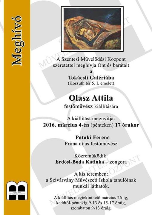 Minden kedves érdeklődőt szeretettel várunk március 4-én (PÉNTEKEN) a Tokácsli Galériába Olasz Attila festőművész tárlatára!