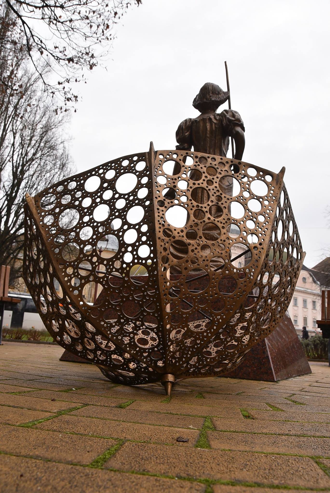 A címben olvasható beszélgetés zajlott le 2016. március 16-án reggel a Kossuth téren a Napernyős lány szobornál. Igen megint letörték a szobor napernyőjét!