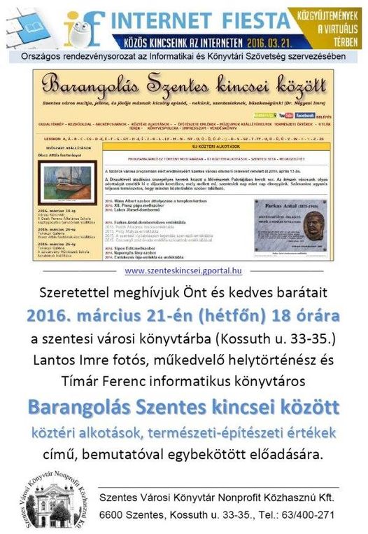 Szeretettel meghívjuk Önt és kedves barátait 2016. március 21-én (hétfőn) 18 órára a szentesi városi könyvtárba (Kossuth u. 33-35.) Lantos Imre fotós, műkedvelő helytörténész és Tímár Ferenc informatikus könyvtáros – köztéri alkotások, természeti-építészeti értékek című, bemutatóval egybekötött előadására.