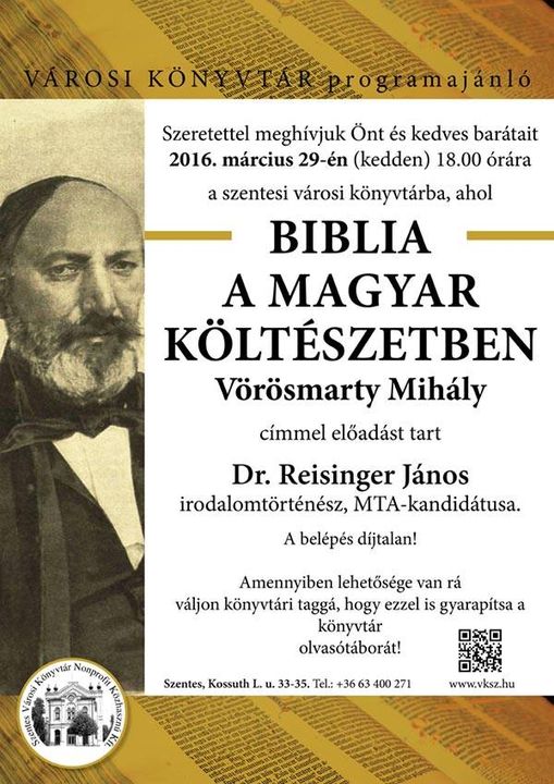 Szeretettel meghívjuk Önt és kedves barátait 2016. március 29-én (kedden) 18.00 órára a szentesi városi könyvtárba, ahol – Vörösmarty Mihály címmel előadást tart Dr. Reisinger János irodalomtörténész, MTA-kandidátusa. A belépés díjtalan!