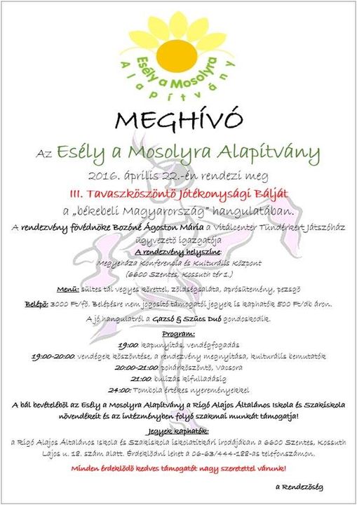 Az Esély a Mosolyra Alapítvány 2016. április 22.-én rendezi meg III. Tavaszköszöntő Jótékonysági Bálját a „békebeli Magyarország” hangulatában a Megyeháza Konferencia és Kulturális Központ dísztermében.
