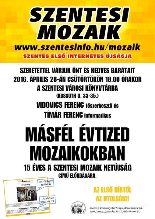 Ezen a napon Tímár Ferenc és Vidovics Ferenc eleveníti fel a Szentesi Mozaik igen mozgalmas másfél évtizedét. Jöjjön el, és bepillantást nyerhet az újság kulisszatitkaiba!