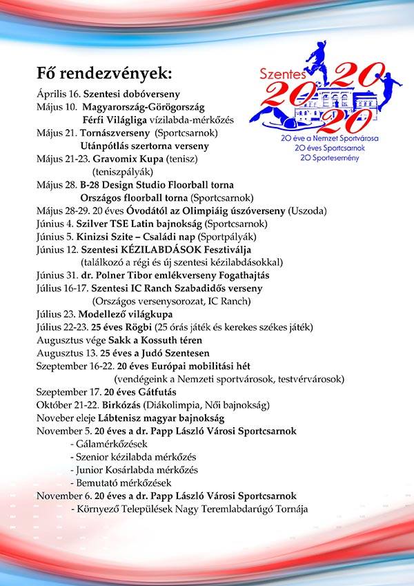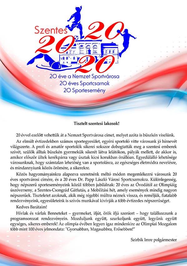 Közös hagyományainkra alapozva szeretnénk méltó módon megemlékezni városunk 20 éves sportvárosi címére, és a 20 éves Dr. Papp László Városi Sportcsarnokra. Különlegesség, hogy népszerű sporteseményeink közül többen jubilálnak: 20 éves az Óvodától az Olimpiáig úszóverseny, a Szentes-Csongrád Gátfutás, a Mobilitási hét, amely események mindig nagyon népszerűek. Tiszteletet azoknak, akik még régebbi múltra néznek vissza, és reméljük, fiatalabb rendezvényeink, egyesületeink is szívós munkával kivívják a több évtizedes népszerűséget.