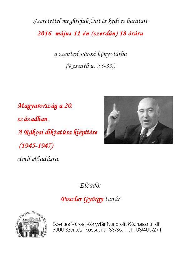 Szeretettel meghívjuk Önt és kedves barátait 2016.május 11-én (szerdán) 18 órára a szentesi városi könyvtárba (Kossuth u. 33-35.) „Magyarország a 20. században: A Rákosi diktatúra kiépítése (1947-1949)” című előadásra.