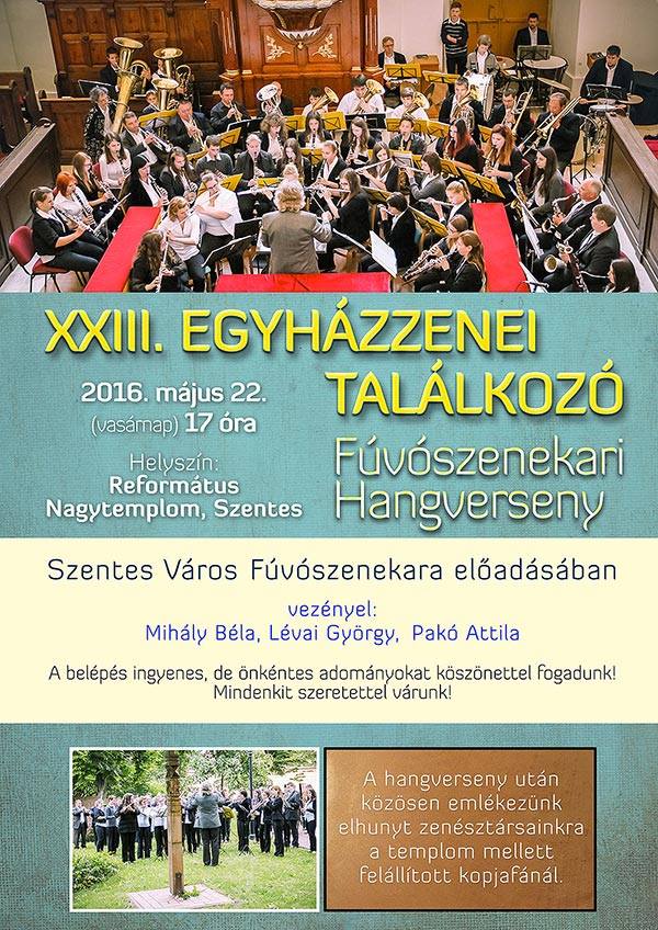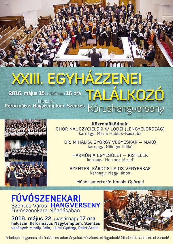 A Szentesi Zenebarátok egyesülete és az Egyházközségek közös szervezésében rendezik meg Szentesen a t. 2016. május 15-én lesz a kórusok találkozója a Református Nagytemplomban, majd utána az egyházzenei találkozó keretein belül ad hangversenyt Szentes Város Fúvószenekara. A 2016. május 22-én megrendezett eseményre is díjtalan a belépés.