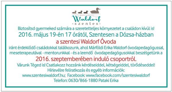 2016.május 19-én 17 órától Szentesen a Dózsa-házban a szentesi waldorf óvoda iránt érdeklődő családokkal és Márföldi Erika Waldorf óvodapedagógussal meseterapeutával és a leendő óvodapedagógusokkal találkozhatnak az érdeklődők és tájékozódhatnak a 2016. szeptemberében induló csoportról.
