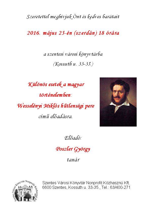 Szeretettel meghívjuk Önt és kedves barátait 2016. május 25-én (szerdán) 18 órára a szentesi városi könyvtárba (Kossuth u. 33-35.)