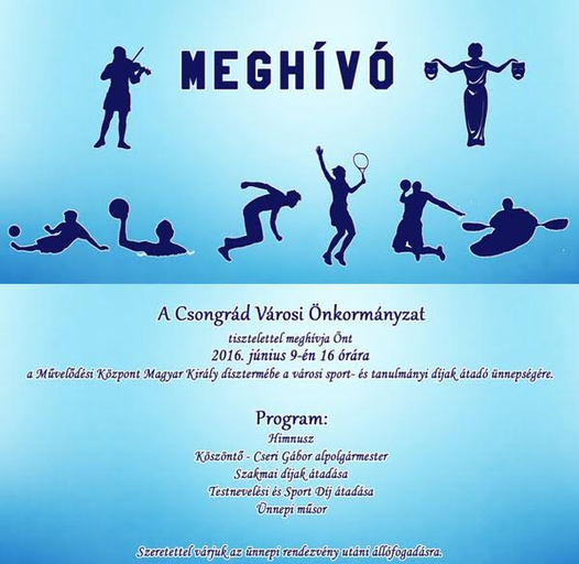 Nagyon Sok Szeretettel szeretnék mindenkit meghívni június 9-én 16 órára Csongrádra a Városi Sport és Pedagógiai díjak átadására.