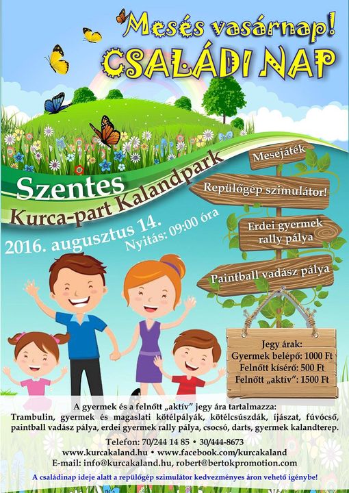 Augusztus 14-én egy csodás családi nap vár minden kedves vendéget, aki ellátogat a szentesi Kurca-part Kalandparkba. Ezen a napon több érdekes dolog is várni fogja a családokat, és legfőképp a gyermekeket. Többek között kipróbálható lesz a paint ball vadász pálya, az új erdei gyermek rally pálya, és az igazán izgalmasnak ígérkező repülőgép szimulátor is. További részletek a plakáton!