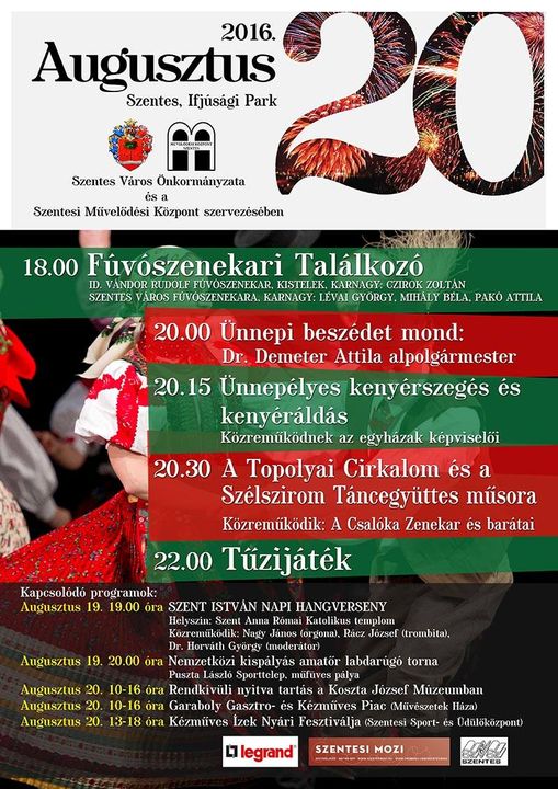 Augusztus 20-án Szent István Napján a Topolyai Cirkalom és a Szélszirom Táncegyüttes műsorán szórakozhatunk a Művelődési és Ifjúsági Háza szabadtéri színpadán. A nap folyamán több program várja az érdeklődőket, melyről a plakátról tájékozódhatnak. A nap zárásaként tűzijáték lesz a Kurca-parton!