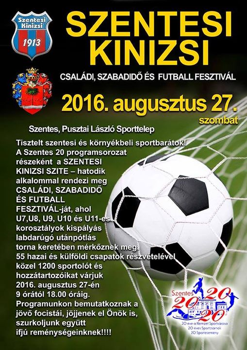 Tisztelt szentesi és környékbeli sportbarátok! A Szentes 20 programsorozat részeként A SZENTESI KINIZSI SZITE – hatodik alkalommal rendezi meg CSALÁDI, SZABADIDŐ ÉS FUTBALL FESZTIVÁL-ját, ahol U7, U8, U9, U10 és U11-es korosztályok kispályás labdarúgó utánpótlás torna keretében mérkőznek meg. 55 hazai és külföldi csapatok részvételével közel 1200 sportolót és hozzátartozóikat várjuk 2016. augusztus 27-én 09 órától 18.00 óráig. Programunkon bemutatkoznak a jövő focistái, jöjjenek el Önök is, szurkoljunk együtt ifjú reménységeinknek!!!!