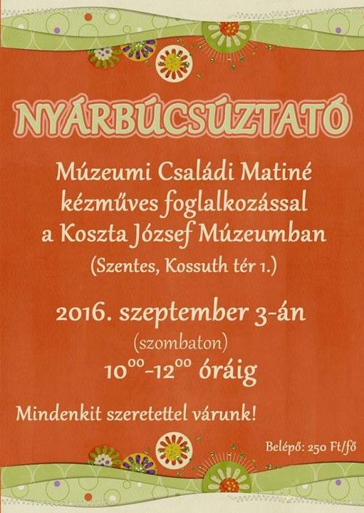 Minden érdeklődőt szeretettel várnak nyárbúcsúztató matinéra 2016. szeptember 3-án 10-12 óra között a Koszta József Múzeumban.