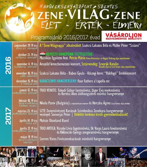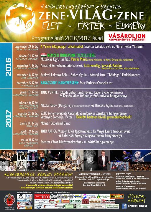 2016. szeptember 29-én indul a 2016/2017-es zenei évad a Hangversenyközpontban. A tizenegy koncertből álló évad valamennyi programját kedvezményes bérlettel tekintheti meg, mely zenei csemegéket is tartalmaz. Bővebb információ a plakáton!