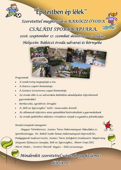 2016. szeptember 17-én, szombat délelőtt 9-12 óra között „Ép testben ép lélek” címmel rendezi meg CSALÁDI SPORTNAP-ját a Rákóczi F. utcai óvoda. Szeretettel várják a szülőket, gyermekeket, érdeklődőket a rendezvényre.
