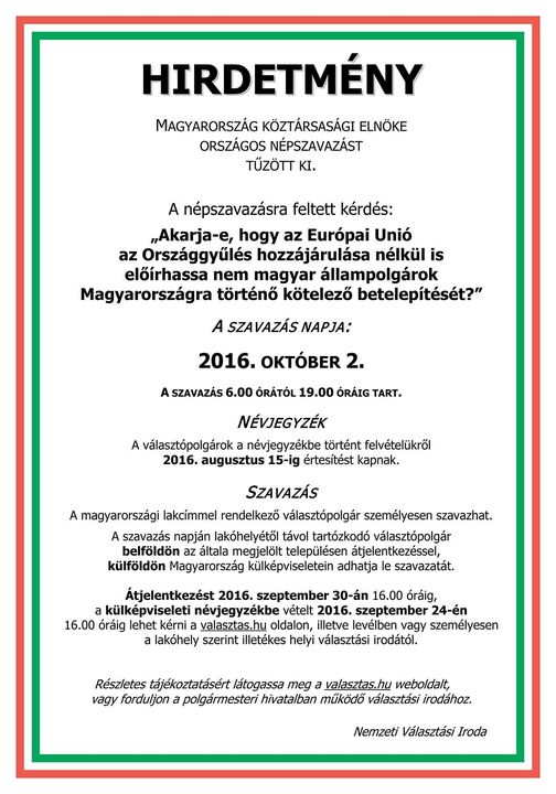 Magyarország köztársasági elnöke országos népszavazást tűzött ki 2016. október 2-ára. A népszavazásra feltett kérdés: ,,Akarja-e, hogy az Európai Unió az Országgyűlés hozzájárulása nélkül is előírhassa nem magyar állampolgárok Magyarországra történő kötelező betelepítését?”