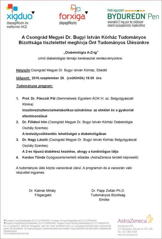 A rendezvény 2016.szeptember 29-én csütörtökön 18 órakor lesz a Megyei Dr. Bugyi István Kórház ebédlőjében. A tudományos program előadásai és további részletek a meghívóban.