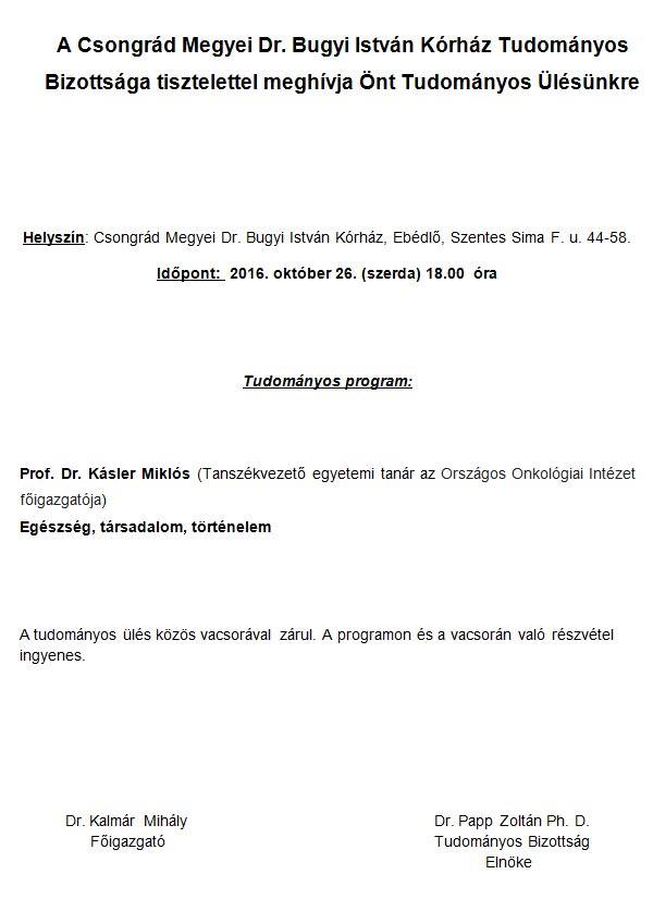 Ennek a következő rendezvénye 2016. október 26-án szerdán 18 órakor lesz a Csongrád Megyei Dr. Bugyi István Kórház ebédlőjében, ahol Prof. Dr. Kásler Miklós tanszékvezető egyetemi tanár, az Országos Onkológiai Intézet főigazgatója tart Egészség, társadalom, történelem címmel előadást.