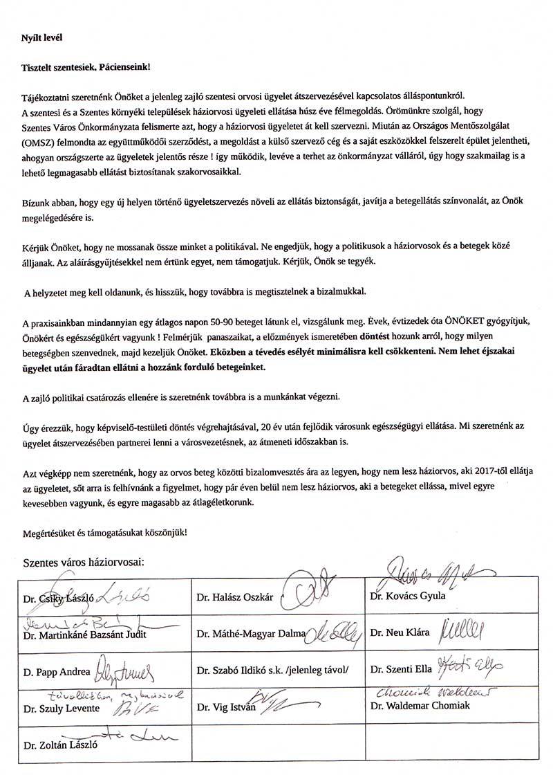 Tisztelt szentesiek. Pácienseink! Tájékoztatni szeretnénk Önöket a jelenleg zajló szentesi orvosi ügyelet átszervezésével kapcsolatos álláspontunkról. A szentesi és a Szentes környéki települések háziorvosi ügyeleti ellátása húsz éve félmegoldás. Örömünkre szolgál, hogy Szentes Város Önkormányzata felismerte azt, hogy a háziorvosi ügyeletet át kell szervezni. Miután az Országos Mentőszolgálat (OMSZ) felmondta az együttműködői szerződést, a megoldást a külső szervező cég és a saját eszközökkel felszerelt épület jelentheti, ahogyan országszerte az ügyeletek jelentős része(!) így működik, levéve a terhet az önkormányzat válláról, úgy hogy szakmailag is a lehető legmagasabb ellátást biztosítanak szakorvosaikkal.